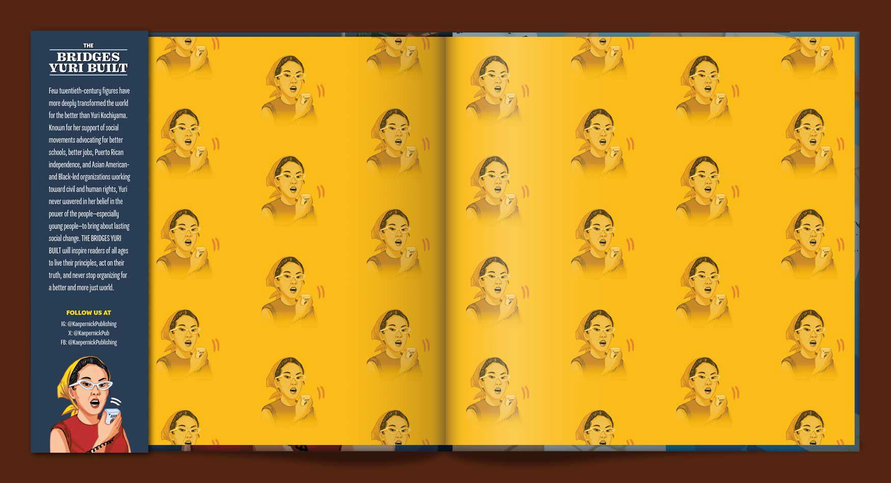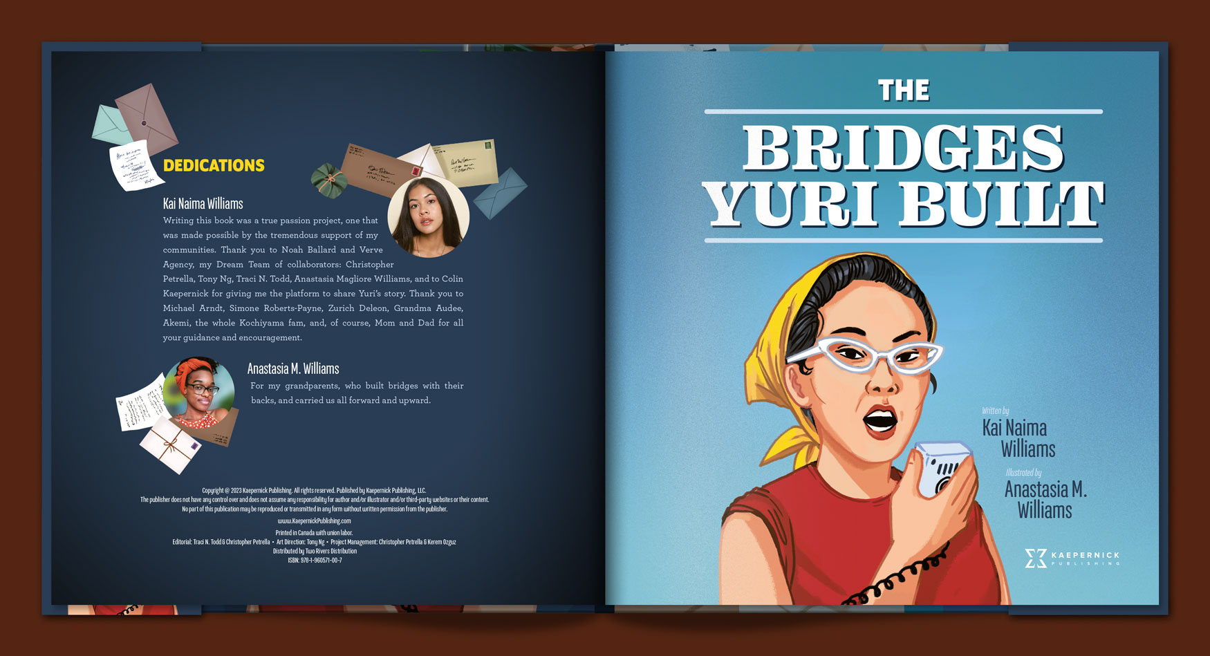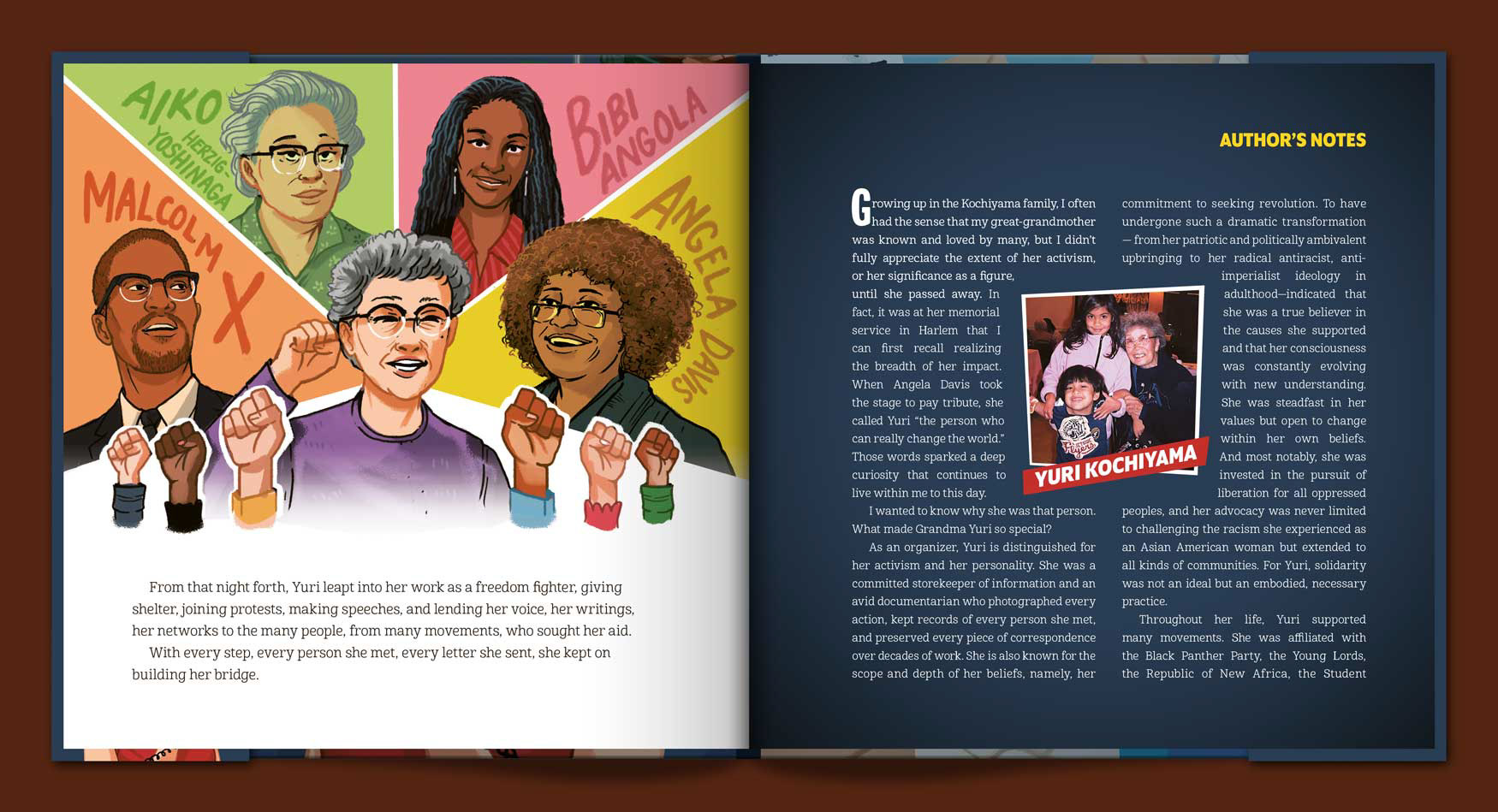 THE BRIDGES YURI BUILT: HOW YURI KOCHIYAMA MARCHED ACROSS MOVEMENTS introduces one of the 20th-century’s most notable freedom fighters, Yuri Kochiyama (1921 – 2014) to the next generation of young readers. Debut children's picture book author Kai Naima Williams – great-granddaughter of Yuri Kochiyama – intimately chronicles the experiences and lessons, hardships and victories, and people and places that shaped Yuri’s life and influenced her activism. From Yuri’s incarceration in a Japanese-American concentration camp during World War II to her participation in movements organizing for better schools in Harlem to her close friendship with Malcolm X, Yuri never wavered in her belief in the power of people – especially young people – to bring about social change. Through imaginative writing and vibrant illustrations (Anastasia Magloire Williams), THE BRIDGES YURI BUILT is sure to inspire young readers to embrace Yuri’s unswerving belief that together we can build a bridge to a better world.